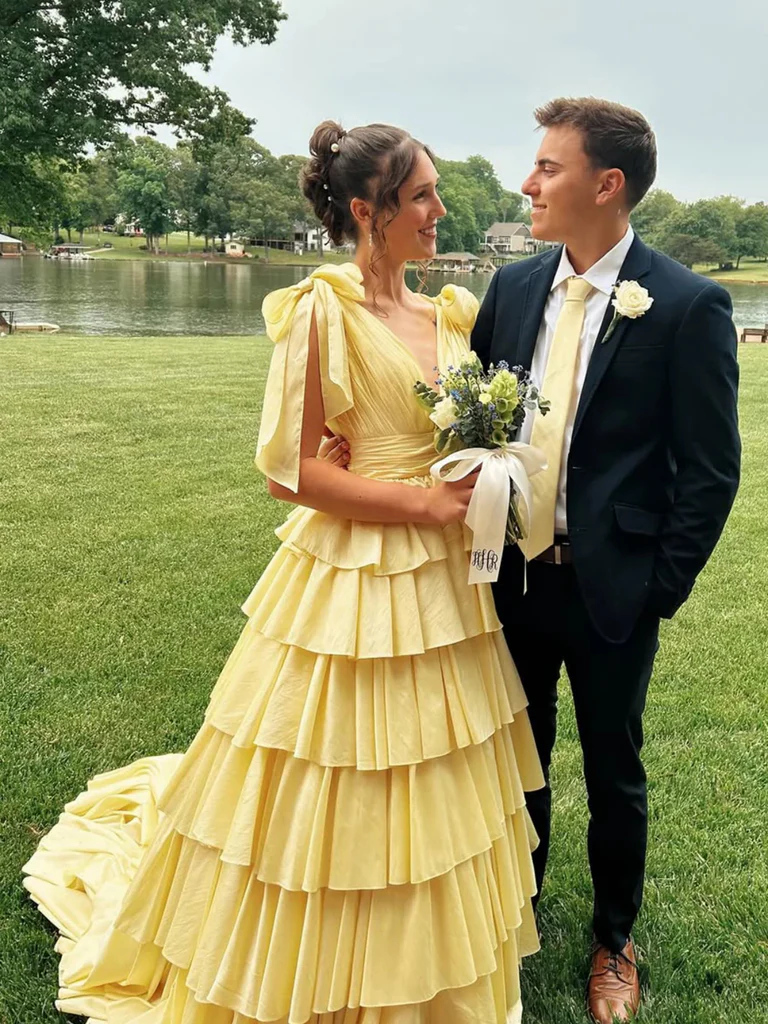 A Line V Neck Layered Yellow Satin Long Prom Dresses, Yellow Layered Formal Evening Graduation Dresses